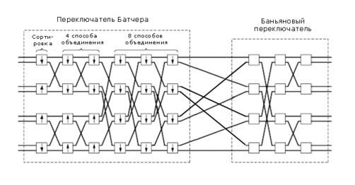 . Ячейки, отсортированные Батчеровской сетью, подаются на вход сети баньяна, где они пересылаются без конфликтов.