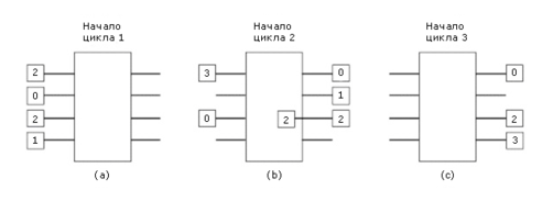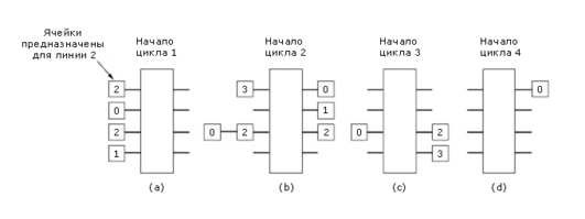 Возможно другое решение: буферизовать ячейки на входе. Идея этого решения показана на рисунке 2-66. Пусть в начале цикла 1 (рисунок 2-66(а)) поступило четыре ячейки, две из которых должны быть отправлены по линии 2. Поскольку из-за линии 2 возник конфликт, то только три ячейки передаются на выходные линии. Поэтому к началу цикла 2 (рисунок 2-66(b)) на выходе переключателя появятся три ячейки, но на вход поступят новые. К началу цикла 3 (рисунок 2-66(с)) на входе останется только одна ячейка, и очередь рассосется только на четвертом цикле. В случае буферизации на входе надо следить за тем, чтобы дисциплина обслуживания возникающих очередей была бы справедливой и равномерно обслуживала очереди на всех линиях.