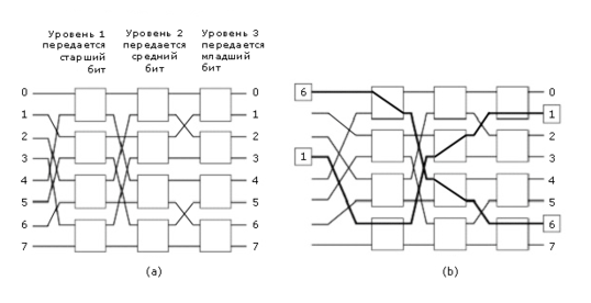 Это решение называют переключателем Батчера-Баньяна. Как и переключатели выталкивающего типа, переключатель Батчера-Баньяна синхронный, т.е. за один цикл он может обрабатывать несколько входных линий. На рисунке 2-69(а) показан трехступенчатый 8х8 переключатель Баньяна. Он называется так, поскольку похож на корни баньянового дерева. В баньяновых переключателях для каждого входа существует ровно один путь к любому из выходов. Маршрутизация пакета происходит в каждом узле на основе адреса выходной линии, которой должен достичь пакет. Адрес выходной линии определяют на входе по номеру виртуального соединения. В данном случае трехбитовый номер впереди ячейки используется в каждом узле для маршрутизации.