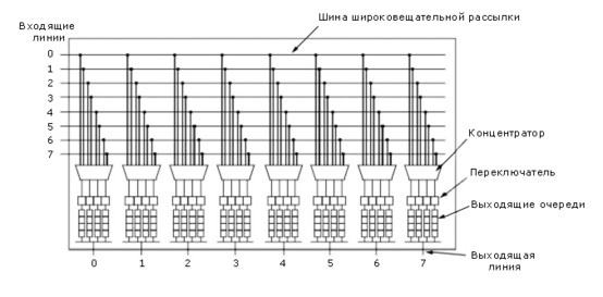 Рассмотрим конструкцию АТМ-переключателя, использующего буферизацию на выходе. Этот тип переключателей называется переключатель выталкивающего типа. Он показан на рисунке 2-68 для конфигурации 8х8 линий. Здесь каждая входная линия соединена с шиной, к которой подключены все выходные линии. Каждая входная шина имеет свой механизм управления, не зависящий от других, что существенно упрощает конструкцию.