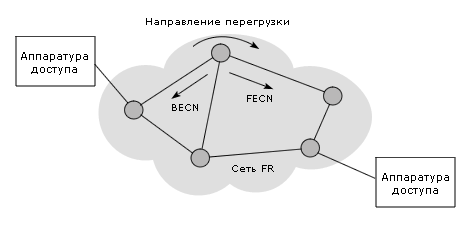 Бит уведомления (сигнализации) отправителя о явной перегрузке (Backward Explicit Сongestion Notification - BECN). Этот бит устанавливают в «1» для уведомления отправителя сообщения о том, что произошла перегрузка в направлении, обратном направлению передачи содержащего этот бит кадра. Бит BECN может не использоваться терминалами абонентов (см. рисунок 3-19), т.е. в этом направлении возник слишком большой поток кадров.