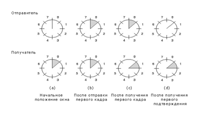 Эта проблема есть следствие правила, по которому отправитель ждет подтверждения прежде, чем пошлет следующий кадр. Это требование можно ослабить - разрешить отправителю отправлять до w кадров, не дожидаясь их подтверждения. Надлежащим выбором значения w отправитель может заполнить все время, необходимое на отправку кадра и получение его подтверждения. В вышеприведенном примере w должно быть равным, по крайней мере, 26. Это то количество кадров, какое отправитель успеет отправить за 520 мсек., прежде чем придет подтверждение на кадр 0. Таким образом, неподтвержденными будут 25 из 26 кадров, размер окна отправителя будет равным 26 кадров.