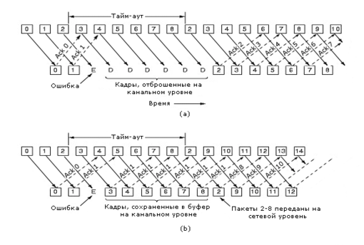 При выборочном повторе у получателя длина окна такая же, как и у отправителя. Отправитель отмечает неподтвержденный кадр и посылает его еще раз. Получатель не передает на сетевой уровень последовательность пакетов, если в ней есть разрывы (рисунок 3-15 (b)).