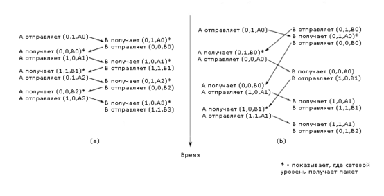 На рисунке 3-14 показан протокол 4. Если у А очень короткий тайм-аут, то все дубликаты кадра пойдут с одним и тем же значением полей seq и ask. Поэтому, получив исправный кадр, В установит значение переменной frame_expected равным 1 и пошлет подтверждение. Все последующие дубликаты будут им отвергнуты, так как он будет ожидать кадра с 1, а не 0.
