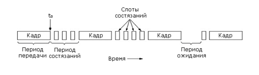 Рассмотрим подробнее алгоритм состязаний. Сколько времени станции, начавшей передачу, нужно, чтобы определить коллизию? Обозначим через τ время распространения сигнала до самой удаленной станции на линии. Для коаксиала в 1 км τ=5 мксек., в таком случае минимальное время для определения коллизии будет равно 2τ. Поэтому станция не может быть уверена, что она захватила канал до тех пор, пока не убедится, что в течение 2τ секунд не было коллизий. Поэтому мы будем рассматривать период состязаний как слотированную систему ALOHA со слотом 2τ секунд на один бит. Захватив канал, станция может далее передавать кадр с любой скоростью.