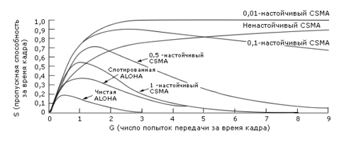 Максимальная пропускная способность достигается при G=0,5 при S=1/2e, что составляет примерно 18% от номинальной пропускной способности. Это означает, что если мы будем генерировать кадры с большей скоростью, чем 18% от скорости канала, то очереди переполнятся и система «захлебнется». Результат не очень вдохновляющий, но это плата за удобство: каждый передает, когда захочет.