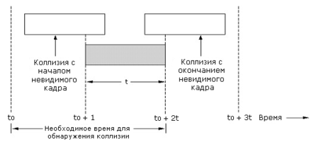 Не важно, когда произошел конфликт: когда первый бит одного кадра «наехал» на последний бит другого кадра или как-то иначе, оба кадра считаются испорченными и должны быть переданы повторно. Контрольная сумма, защищающая данные в кадре, не позволяет различать разные случаи наложения кадров.