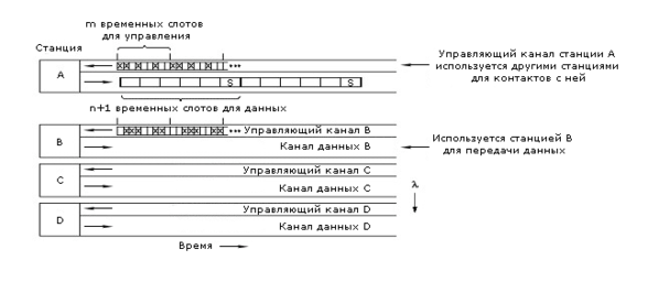 Обозначим через m число слотов в управляющем канале и через n+1 - в канале данных. Из них n слотов - для данных, а последний - для сообщения о статусе канала. Протокол поддерживает три класса трафика: