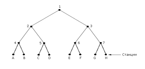 На рисунке 4-8 показано, как эта процедура применяется к станциям. Станции - листья. За слот 0 борются все станции. Если какая-то победила - хорошо. Если нет, то за слот 1 борются только станции поддерева с корнем в вершине 2. Если какая-то победила, то следующий слот резервируется для станций поддерева 3. Если был конфликт, то за следующий слот борются станции поддерева 4, и т.д.