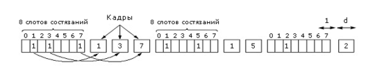 Рассмотрим подробнее алгоритм состязаний. Сколько времени станции, начавшей передачу, нужно, чтобы определить коллизию? Обозначим через τ время распространения сигнала до самой удаленной станции на линии. Для коаксиала в 1 км τ=5 мксек., в таком случае минимальное время для определения коллизии будет равно 2τ. Поэтому станция не может быть уверена, что она захватила канал до тех пор, пока не убедится, что в течение 2τ секунд не было коллизий. Поэтому мы будем рассматривать период состязаний как слотированную систему ALOHA со слотом 2τ секунд на один бит. Захватив канал, станция может далее передавать кадр с любой скоростью.