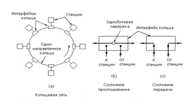 Интерфейс станций может работать в двух режимах: прослушивания и передачи. В режиме прослушивания он лишь копирует бит в свой буфер и передает этот бит дальше по кольцу. В режиме передачи, предварительно захватив маркер, интерфейс разрывает связь между входом и выходом и начинает передачу. Чтобы быть способным за однобитовую задержку переключиться из одного режима в другой, интерфейс должен предварительно забуферизовать данные для передачи.