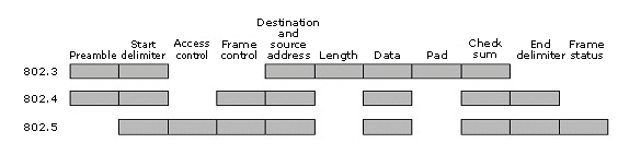 Третьей, и наиболее серьезной проблемой является то, что все три стандарта имеют разную максимальную длину кадра. Для 802.3 на 10 Мбит/сек. это 1500 байт, для 802.4 - 8191 байт, для 802.5 максимальная длина ограничена временем удержания маркера. Последняя величина по умолчанию имеет значение 10 мсек., что соответствует 5000 байтам.