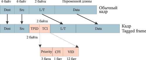 Рис. 3. Сравнение обычного Ethernet-кадра и кадра с меткой