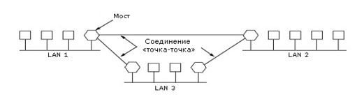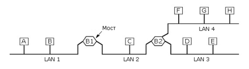 Как мы уже говорили, основная цель использования мостов – соединение отдельных ЛВС между собой. Это можно сделать, сопоставив каждой ЛВС мост и соединив мосты между собой каналом «точка-точка». Пример такого соединения показан на рисунке 4-39. Здесь каждый канал точка-точка можно рассматривать как ЛВС без абонентских машин (кто сказал, что сеть обязана всегда их иметь). Тогда у нас есть шесть ЛВС, соединенных через четыре моста.