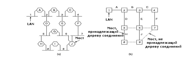 Решение этой проблемы состоит в том, чтобы мосты во взаимодействии друг с другом накладывали на фактическую структуру соединений дерево соединений и делали пересылку так, чтобы избегать таких мнимых циклов. На рисунке 4-36 показана сеть с 10 мостами. Граф соединений на рисунке 4-36 (а) можно сократить до дерева соединений на рисунке 4-36 (b). В этом дереве для каждой сети есть только один путь.