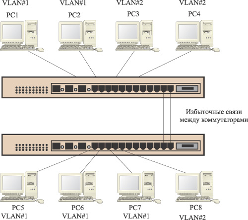 Рассмотрим для примера ситуацию, когда сеть построена на базе двух коммутаторов, поддерживающих технологию организации виртуальных сетей на основе группировки портов (рис. 2).