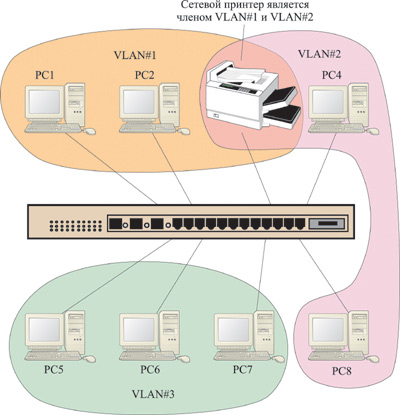 При использовании технологии группировки портов один и тот же порт может быть одновременно приписан к нескольким виртуальным сетям, что позволяет реализовывать разделяемые ресурсы между пользователями различных виртуальных сетей. Например, чтобы реализовать совместный доступ к сетевому принтеру или к файл-серверу пользователей виртуальных сетей VLAN#1 и VLAN#2, тот порт коммутатора, к которому подключается сетевой принтер или файл-сервер, нужно приписать одновременно к сетям VLAN#1 и VLAN#2 (рис. 1).