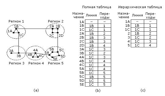 На рисунке 5-16 (а) приведен пример сети с двухуровневой иерархией из пяти регионов. Здесь каждый из регионов соединен с двумя другими. На рисунке 5-16 (b) показана полная таблица маршрутизации для маршрутизатора 1А без иерархии. На рисунке 5-16 (с) – та же таблица при двухуровневой иерархии. Нетрудно видеть, что таблица маршрутизации во втором случае резко сократилась.