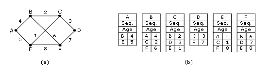 После того как измерения выполнены, можно сформировать пакет о состоянии каналов. На рисунке 5-14 показаны пакеты для примера сети. В пакете указаны: отправитель, последовательное число, возраст (назначение этих полей станет ясно позднее), список соседей и задержки до них. Формирование таких пакетов не вызывает проблем. Основной вопрос - когда их формировать? Периодически, с каким-то интервалом, или по особому событию, когда в транспортной подсети произошли какие-то существенные изменения?
