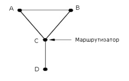Однако и в алгоритме разделения направлений есть «дыры». Рассмотрим подсеть на рисунке 5-12. Если линия между С и D будет разрушена, то С сообщит об этом А и В. Однако А знает, что у В есть маршрут до D, а В знает, что такой маршрут есть и у А. И опять мы «сваливаемся» в проблему бесконечного счетчика.