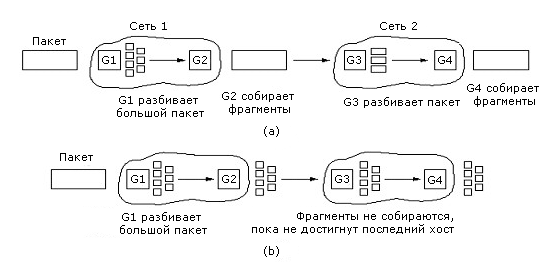 Есть два подхода к тому, как это осуществлять. Первый - делать фрагменты столь малыми, что любая сеть на их пути будет прозрачна для них. Это решение показано на рисунке 5-40 (а). Когда поступает большой пакет, его разбивают на малые и все пакеты отправляют на один и тот же выходной шлюз, где они собираются снова в большой пакет.