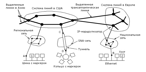 Интернет представляет собой объединение подсетей, которые называются автономными системами. Автономные системы – это подсеть, охватывающая единую территорию, находящаяся под единым административным управлением и имеющая единую политику маршрутизации по отношению ко всем остальным сетям. В Интернете нет какой-либо регулярной, специально предусмотренной структуры подсетей. Он образован из соединения большого числа подсетей, среди которых можно выделить несколько остовых. К этим остовым сетям подключены региональные сети, к которым подключены локальные сети организаций. На рисунке 5-43 показана схема соединения таких остовых сетей.
