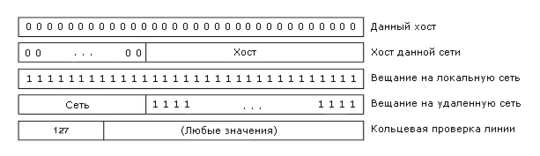 Все адреса разделяются на классы. Всего есть пять классов адресов: А, B, C, D, E. Классы A позволяет адресовать до 126 сетей по 16 миллионов машин в каждой, B - 16382 сетей по 64К машин, C - 2 миллиона сетей по 256 машин, D - предназначены для групповой передачи, Е - зарезервированы для развития. Адреса выделяет только организация NIC - Network Information Center. Несколько адресов, показанных на рисунке 5-46, имеют специальное назначение. Адрес из одних нулей используется при загрузке машины.