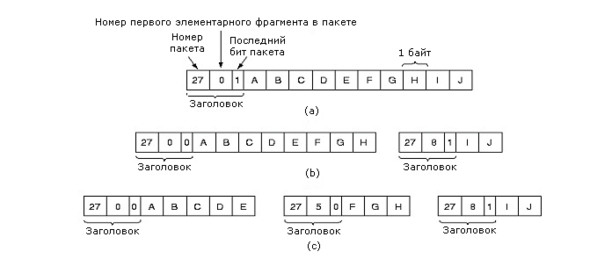 Рисунок 5-41. Фрагментация: (а) Исходный пакет, содержащий 10 байтов данных; (b) Фрагменты после прохождения сети с максимальным размером пакета, равным 8 байтам; (с) Фрагменты после прохождения через шлюз с размером 5