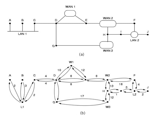 На рисунке 5-50 (a) показаны все три вида сетей. Отметим, что хосты не играют никакой роли в OSPF. OSPF абстрагируется от конкретных сетей, маршрутизаторов и хостов в форме ориентированного графа, каждая дуга в котором имеет вес, представляющий собой задержку, расстояние и т.п. В этом графе находится кратчайший путь на основе весов дуг. Последовательный канал между узлами представляют две дуги, которые могут иметь разный вес. Сеть с множественным доступом представляет узел, соединенный с маршрутизаторами этой сети дугами с весом 0, часто опускаемыми на рисунках. На рисунке 5-50 (b) показан такой граф.