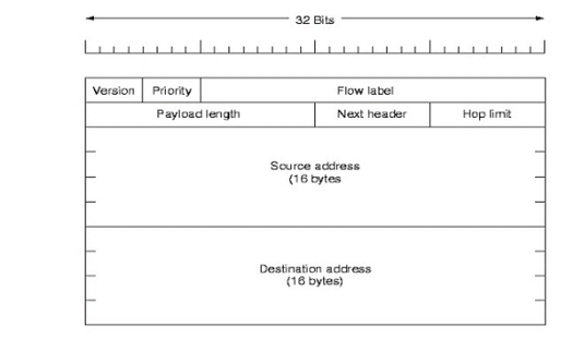 Первым идет четырехбитное поле Version (Версия), его значение равно 6. Следующее поле - Priority (Приоритет) - длиной 8 бит используется для установки приоритета пакета. Приоритет увеличивается с ростом значения этого поля. Значения 0...7 используются для пакетов, время доставки которых не лимитировано, например, значение 1 рекомендуется использовать для новостей, 2 — для почты, 7 — для служебного трафика (SNMP, маршрутизирующие протоколы). Значения 8...15 используются для пакетов, задержка доставки которых нежелательна, например аудио и видео в реальном времени. Далее следует поле Traffic Class, первоначально называвшееся «Flow Label», длиной 20 бит. Оно служит для идентификации последовательности пакетов. Его значение присваивается при помощи генератора случайных чисел и имеет одинаковую величину у всех пакетов данной последовательности. Следующее поле - Payload Length - содержит размер данных, следующих за заголовком, в байтах и имеет длину 16 бит. Следом расположено поле Next Header, идентичное по назначению полю Protocol протокола IPv4 и использующее те же значения. Восьмибитное поле Hop Limit аналогично по назначению полю Time to Live. Оно устанавливается источником согласно разумным предположениям о длине маршрута, а затем уменьшается на 1 при каждом прохождении через маршрутизатор. При снижении значения поля до нуля пакет снимается, как «заблудившийся». Последними идут поля адресов источника и приемника длиной 128 бит (16 байт) каждое. Адреса в стандарте IPv6 имеют более сложную структуру, чем в предыдущем, при этом используются префиксы разной длины.