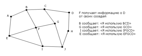 BGP-протокол легко решает проблему «счета до бесконечности». Предположим, что маршрутизатор G или линия FG отказали. Тогда F получит от своих соседей три оставшихся маршрута до D. Поскольку маршруты IFGCD и EFGCD проходят через G, то он их отбросит и воспользуется FBCD.
