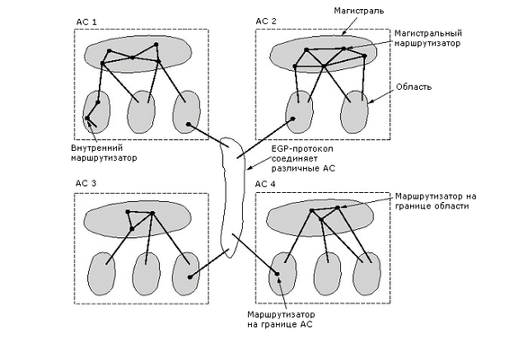 Для маршрутизации между АС используется BGP - протокол пограничных шлюзов. Основное отличие BGP от OSPF проистекает из различия в целях. При маршрутизации внутри АС основная цель - наикратчайший маршрут. При маршрутизации между АС надо учитывать также ряд условий, вызванных политикой конкретной АС.