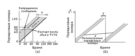 Проблема возникает, когда машина восстанавливается после сбоя. Транспортный агент не знает в этот момент, какое число можно использовать для очередного номера. Чтобы избежать повторного использования порядкового номера, который уже был сгенерирован перед сбоем машины, вводится специальная величина по времени, которая образует область запрещенных номеров (см. рисунок 6-10).