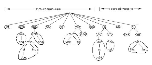 Все пространство доменов распределено на зоны. Как это происходит, мы кратко рассмотрим ниже. Имена зон можно условно разделить на организационные и географические. На высшем уровне в этой иерархии зарегистрированы следующие организационные зоны: