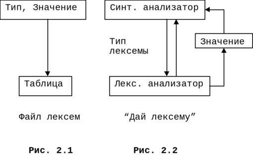 ексический анализатор может работать или как самостоятельная фаза трансляции, или как подпрограмма, работающая по принципу "дай лексему". В первом случае (рис. 2.1) выходом лексического анализатора является файл лексем, во втором (рис. 2.2) лексема выдается при каждом обращении к лексическому анализатору (при этом, как правило, тип лексемы возвращается как значение функции "лексический анализатор", а значение передается через глобальную переменную). С точки зрения формирования значений лексем, принадлежащих классам лексем, лексический анализатор может либо просто выдавать значение каждой лексемы и в этом случае построение таблиц переносится на более поздние фазы, либо он может самостоятельно строить таблицы объектов (идентификаторов, строк, чисел и т.д.). В этом случае в качестве значения лексемы выдается указатель на вход в соответствующую таблицу.