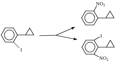 в) В работе [41] приведена реакция нитрования орто-иод-фенилциклопропана в условиях, применяемых для нитрования фенилциклопропана [32] (т.е действием на орто-иод-фенилциклопропан дымящей азотной кислоты в уксусном ангидриде при -50º), результатом которой явилось образование 2-нитрофенилциклопропана (~53%).