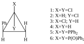 При восстановлении 1,1-дихлоро-2-фенилциклопропана (I) ионом [PPh2−] в Me2SO вдобавок к небольшим количествам (II) и (III) был получен и выделен в результате окисления в виде (VI) бис(фосфин) (V) [28]. Этот продукт замещения, возможно, был получен вследствие процесса элиминирования-присоединения [29].