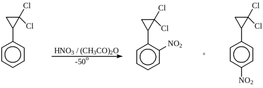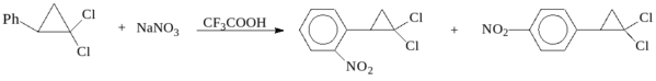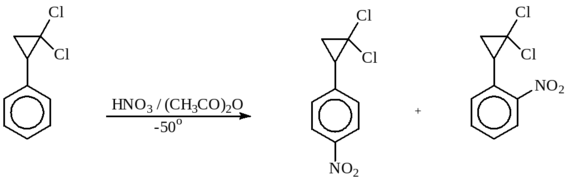 б) При нитровании гем.-дихлорфенилциклопропана нитратом натрия в трифторуксусной кислоте (0º) при разных соотношениях реагентов (1:1, 1:2, 1:3) во всех случаях была получена смесь орто- и пара-нитрофенил-гем.-дихлорциклопропанов в соотношении 1:1,45 [40].