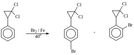 В литературе имеются данные, что гем.-дигалогензамещенное циклопропановое кольцо менее склонно к раскрытию трехчленного цикла, чем незамещенное [30, 31, 32], поэтому в реакциях электрофильного замещения гем.-дигалогензамещенного фенилциклопропана можно использовать более жесткие условия, чем в аналогичных реакциях для фенилциклопропана.