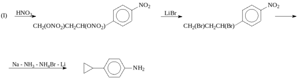 Сотрудниками Университета г.Гента (Бельгия) был предложен синтез п-циклопропиланилина в результате серии превращений из 4-фенил-1,3-диоксана (I)