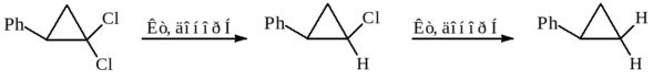 Характер процесса гидрогалогенирования существенно меняется при использовании в качестве источника водорода NaBH4. Так, скорость парциального восстановления 1,1-дихлорфенилциклопропана возрастает в 30 раз. Образующийся монохлорид подвергается дальнейшему дегалогенированию в фенилциклопропан. Скорость замещения второго атома хлора намного ниже, чем первого. Вследствие этого в реакционной смеси накапливается преимущественно продукт парциального восстановления (93,3%). Наряду с ним в катализате содержится 2% фенилциклопропана и 4,7% продукта раскрытия циклопропанового кольца.