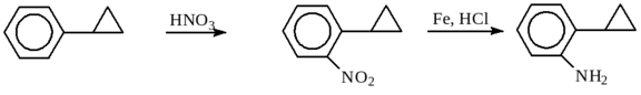 а) В 1959 году группой ученых лаборатории органического синтеза (кафедра органической химии, МГУ им. Ломоносова) была разработана методика нитрования фенилциклопропана, позволяющая получать мононитропроизводное с высокими выходами (70-75%) [32, 38]. Нитрование осуществлялось действием на фенилциклопропан дымящей азотной кислоты в уксусном ангидриде при -50º. Положение нитрогруппы в полученном нитросоединении устанавливалось окислением. Было показано, что это нитросоединение практически не окисляется нейтральным и щелочным растворами перманганата калия; его удалось окислить в условиях, применяемых для окисления нитротолуолов [39], т.е. действием бихромата калия в растворе 50% серной кислоты при нагревании. Продуктом окисления явилась о-нитробензойная кислота (выход 75%); следовательно, нитрогруппа вступила в орто-положение бензольного кольца [38]. Полученный о-нитрофенилциклопропан был восстановлен далее в соответствующий амин.