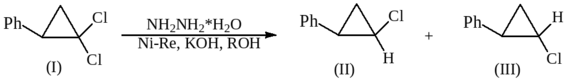 Восстановление гем.-дихлорциклопропановых соединений (I) N2H4•H2O в присутствии Ni(Re) в спиртах протекает селективно с образованием смеси Z-(II) и E-(III) монохлорциклопропанов (общий выход 86%) [8]. Соотношение изомеров (II) и (III) устанавливали методами ГЖХ и ПМР спектроскопии. Предпочтительным является образование Z-изомера: (II):(III)=2:1.