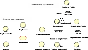 Это структурный бизнес-образец, в нем отсутствует динамическое представление. Классы-участники: Employee Profile – данные о служащем; Organization Profile – данные об организации; Employment – наем служащего (период занятости); Position – должность; Position Assignment – занимаемая служащим должность.