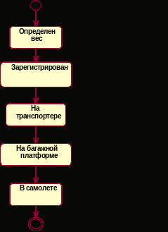 иаграммы состояний для моделирования жизненного цикла экземпляров того или иного исполнителя или экономического ресурса, т. е. деловой сущности, (в примере видно, что экземпляр деловой сущности Багаж меняет свои внутренние состояния, принимая сообщения от исполнителей, изображенные как события «Поставлен на весы», «Прикреплена бирка» и т. д.);