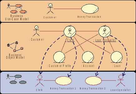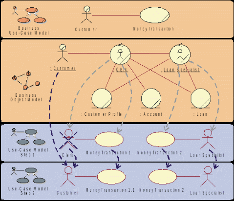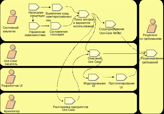 Спецификация требований в технологии Rational Unified Process не требует обязательного моделирования бизнес-процессов организации, для которых создается ПО, однако, наличие бизнес-моделей существенно упрощает построение системной модели вариантов использования. При переходе от бизнес-модели к начальной версии модели вариантов использования применяются следующие правила:
