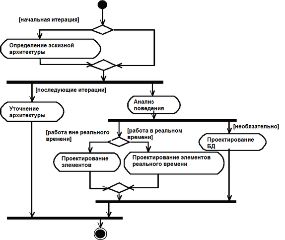 роцесс анализа и проектирования является итерационным, т. е. разбит на несколько итераций в ходе которых выполняется часть работ по анализу и проектированию части системы. Результаты каждой итерации интегрируются в общую модель. Поток работ можно представить диаграммой деятельности: