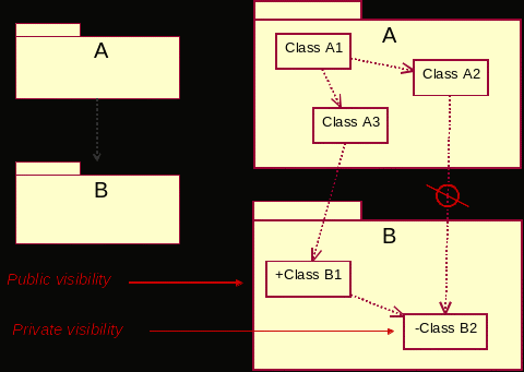 После выделения пакетов устанавливаются зависимости между ними и видимость членов пакета. К закрытым членам пакета доступ извне запрещен. Это позволяет скрыть внутреннее устройство пакета.