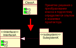 сложный класс анализа может быть разбит на несколько классов, преобразован в пакет или в подсистему.