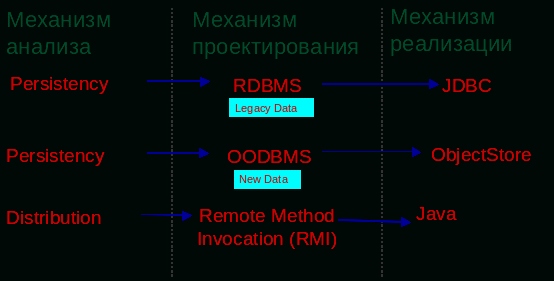 В качестве примера рассмотрим механизм Persistency – хранение экземпляров устойчивых классов в БД. Предположим, что в проекте системы регистрации в качестве языка программирования используется Java. Поскольку существующая система каталога курсов функционирует на основе реляционной СУБД, механизмом проектирования, обеспечивающим доступ к этой внешней базе данных, будет RDBMS (Relational Database Management System), реализовать который можно решением JDBC (Java Database Connectivity).